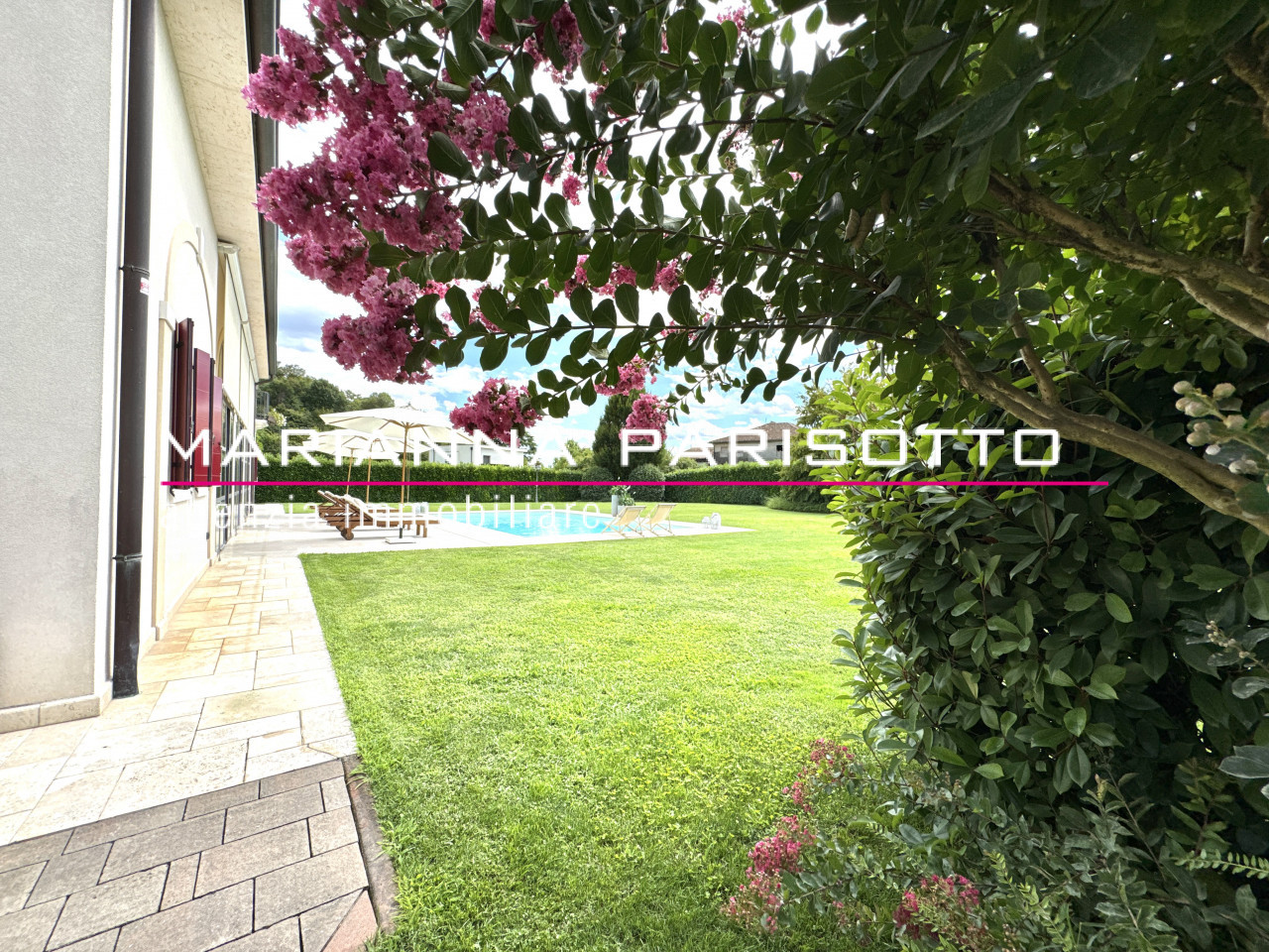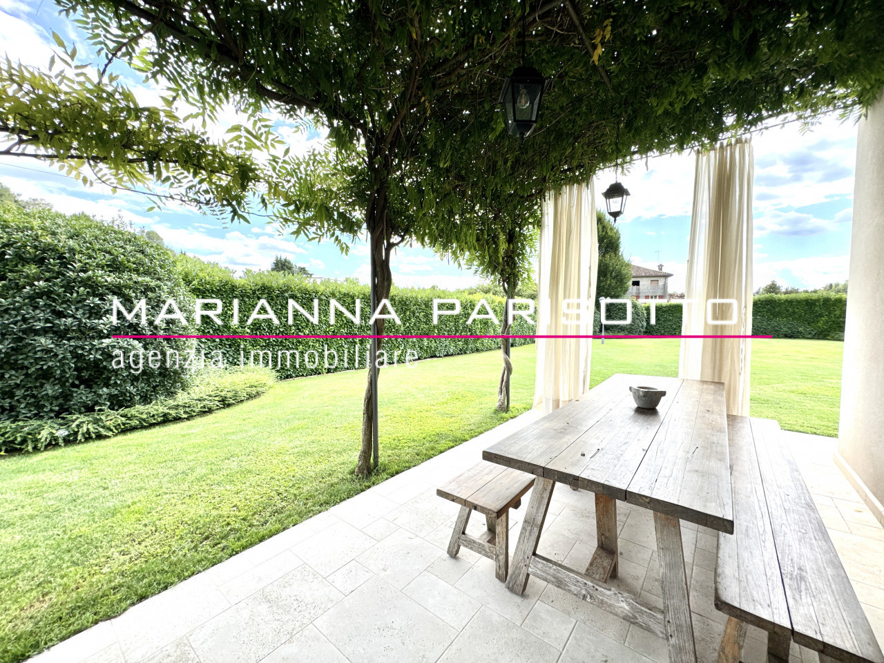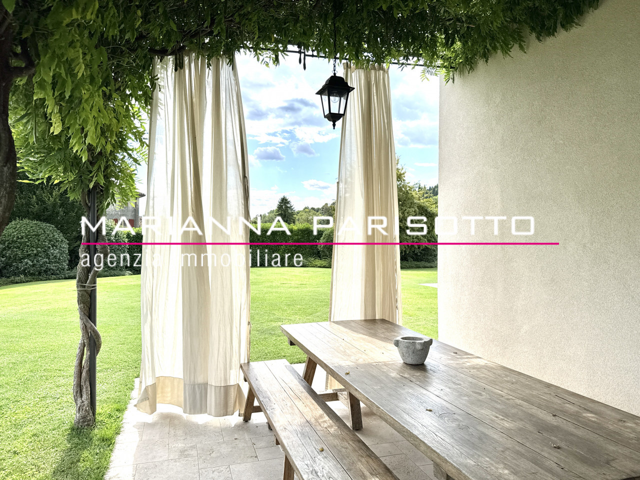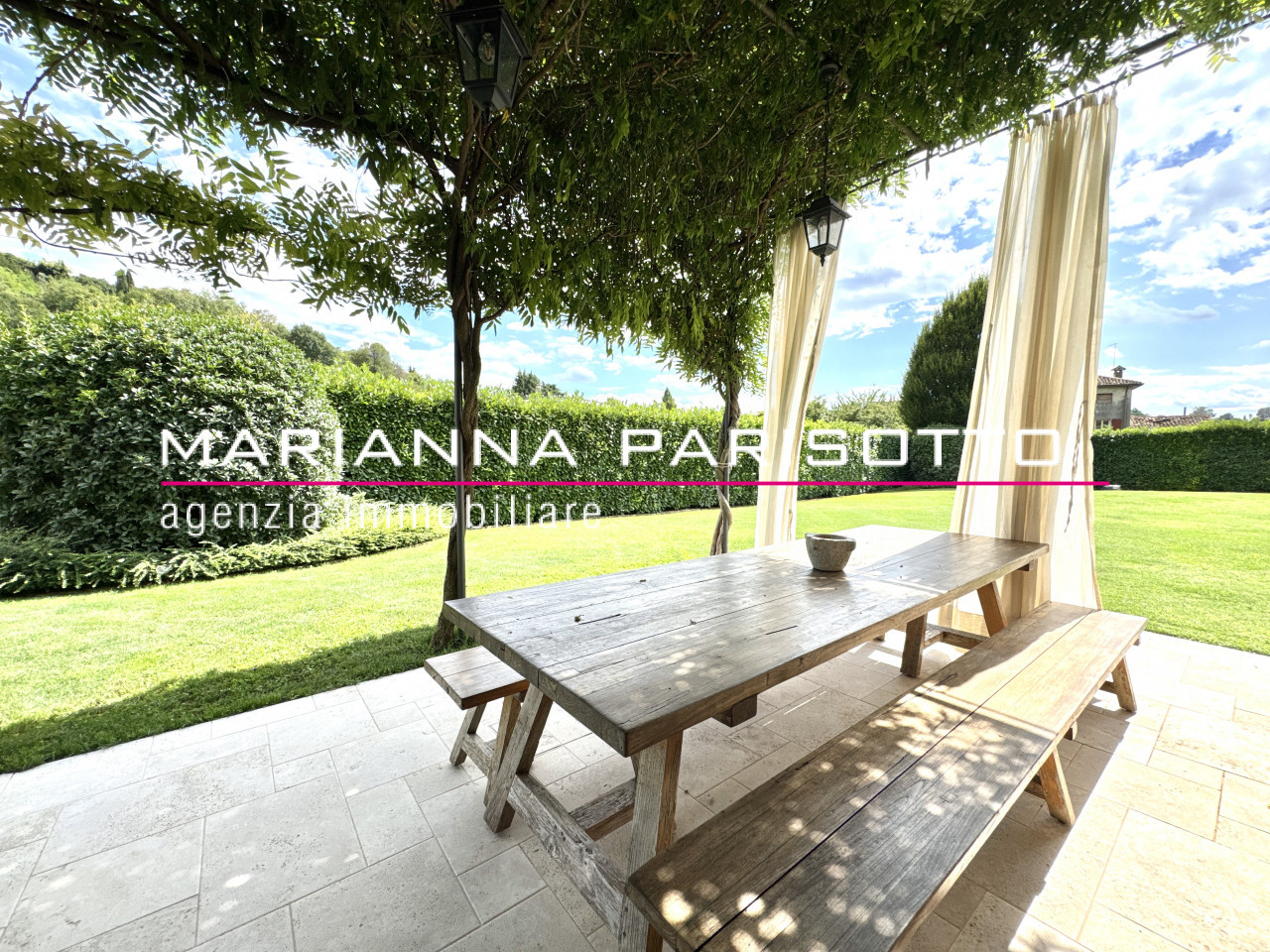 Il parco che circonda la villa è ampio e curato, con alberature mature e zone relax, oltre a un grande patio coperto che permette di pranzare all’aperto in ogni stagione, accolti dal canto degli uccelli e dal verde che avvolge la proprietà come un abbraccio discreto.
