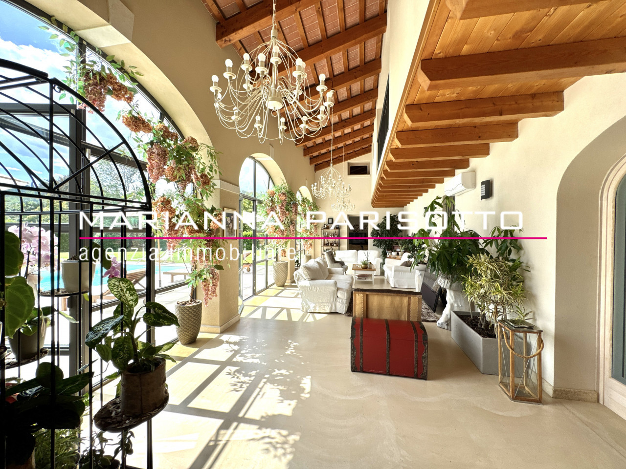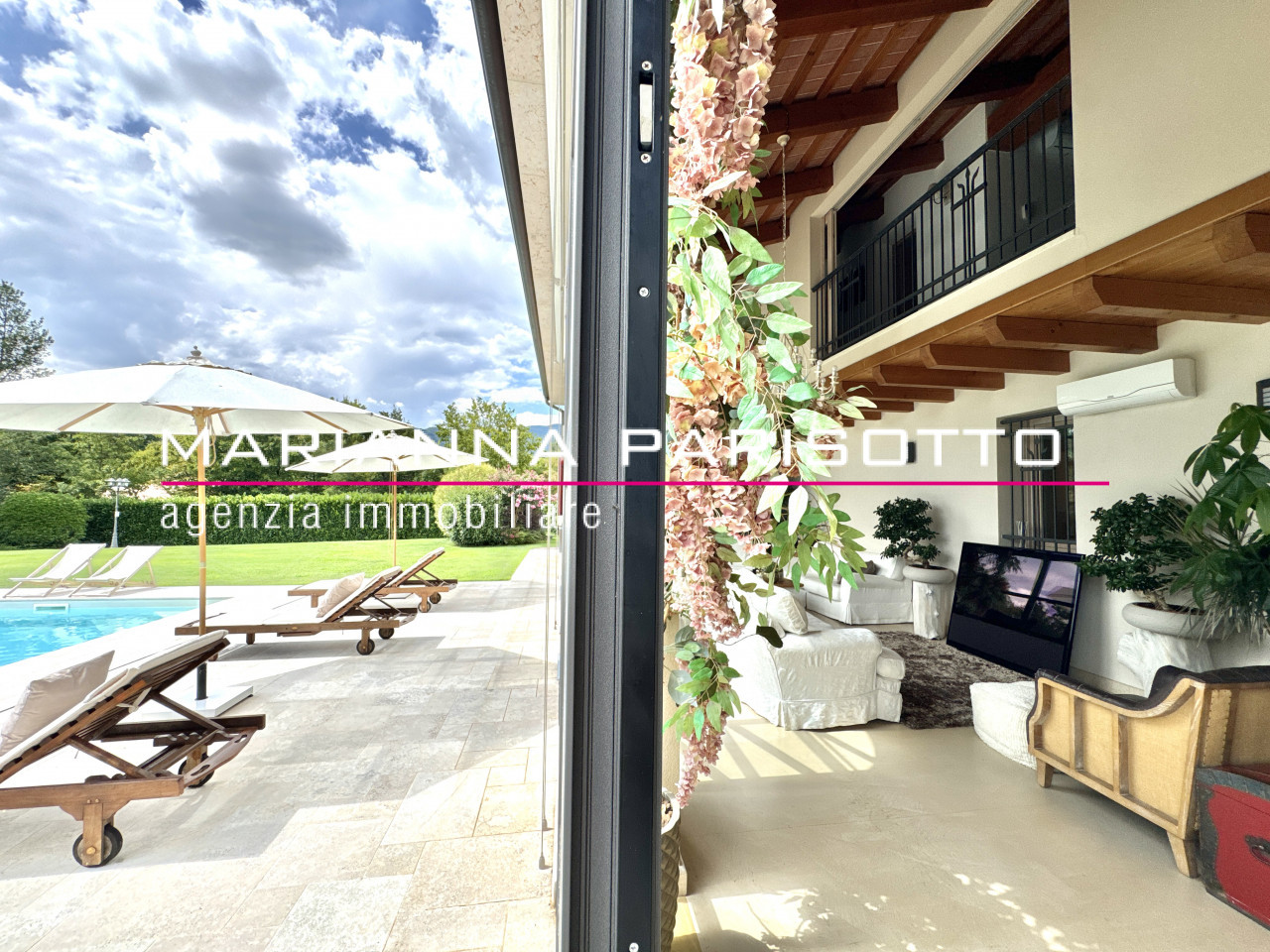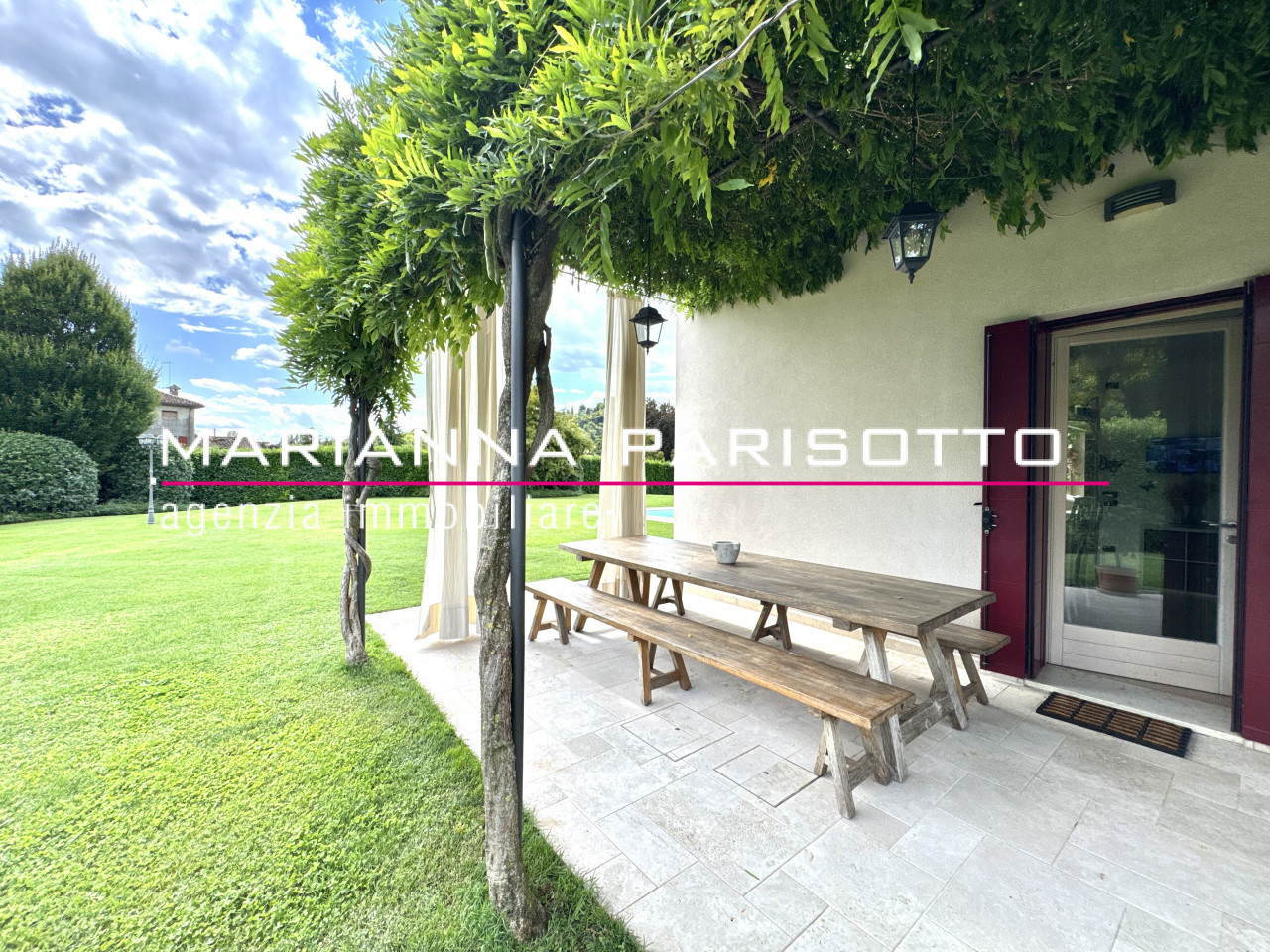 Il parco che circonda la villa è ampio e curato, con alberature mature e zone relax, oltre a un grande patio coperto che permette di pranzare all’aperto in ogni stagione, accolti dal canto degli uccelli e dal verde che avvolge la proprietà come un abbraccio discreto.
