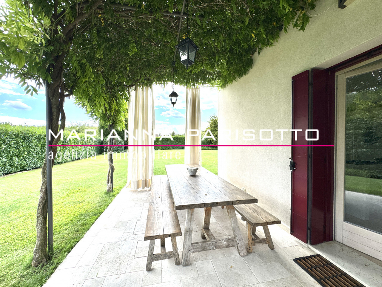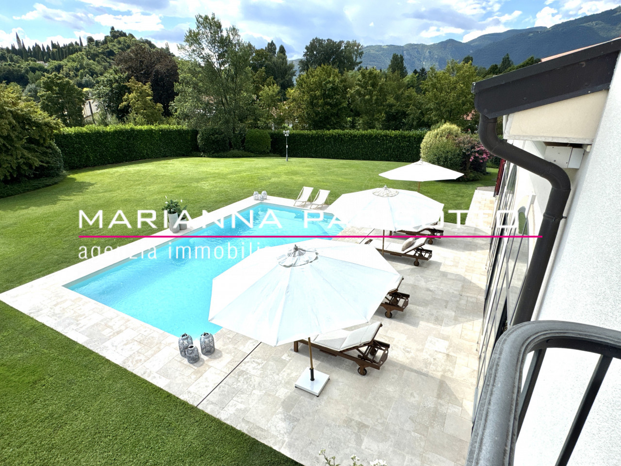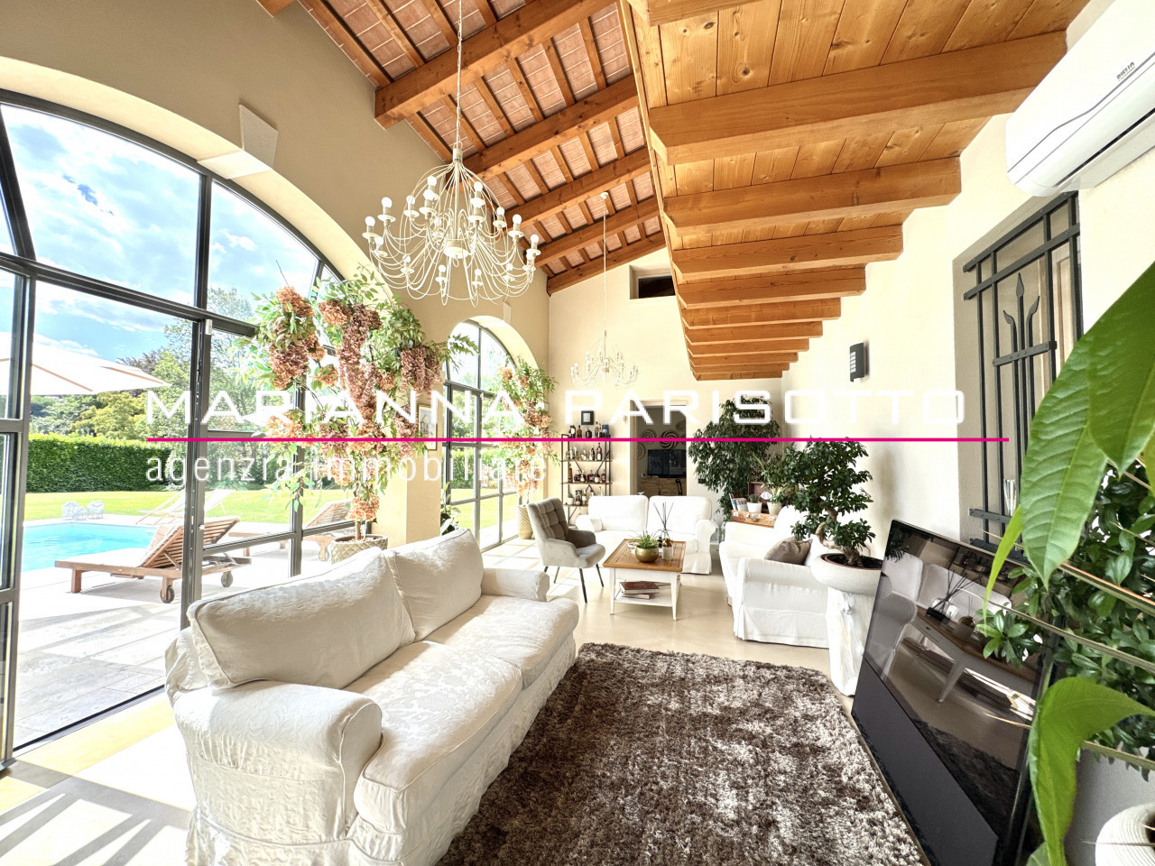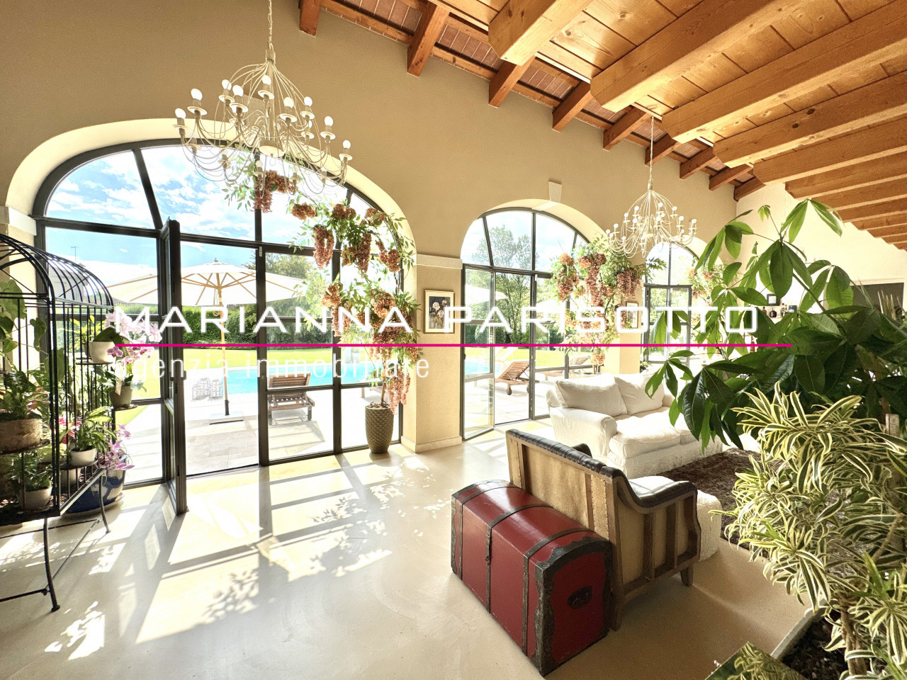 Il parco che circonda la villa è ampio e curato, con alberature mature e zone relax, oltre a un grande patio coperto che permette di pranzare all’aperto in ogni stagione, accolti dal canto degli uccelli e dal verde che avvolge la proprietà come un abbraccio discreto.