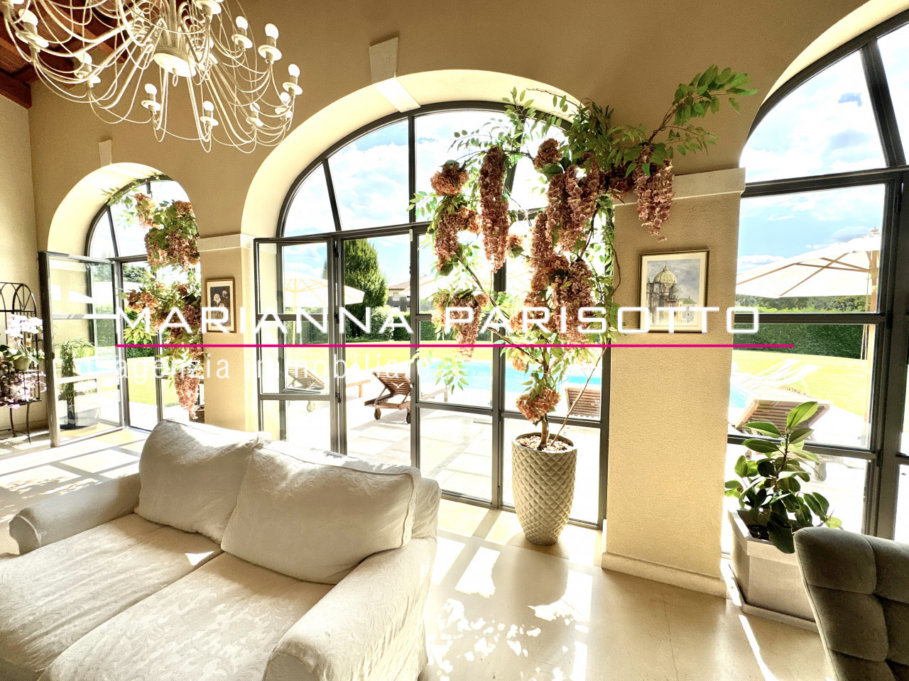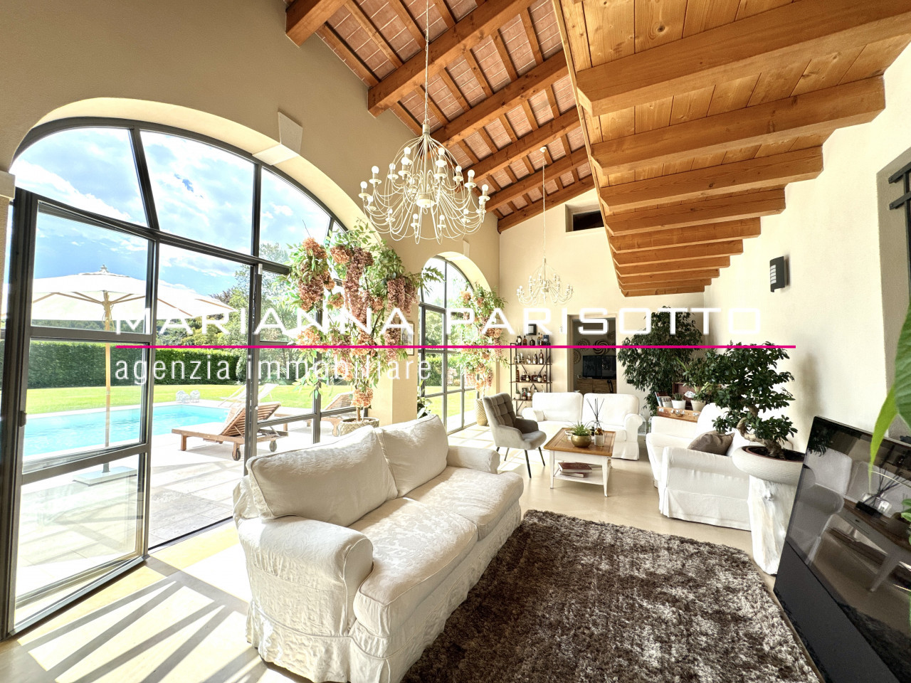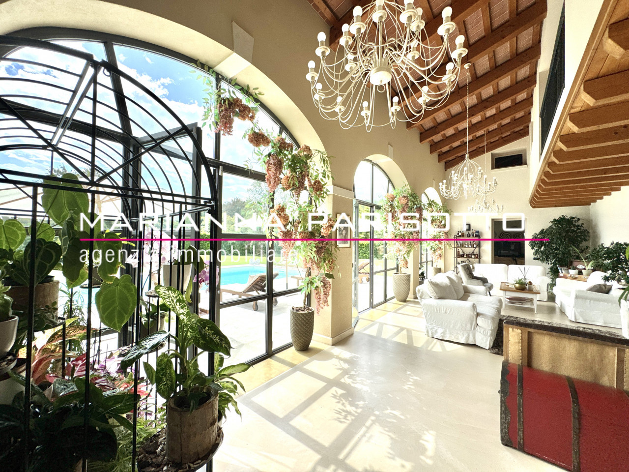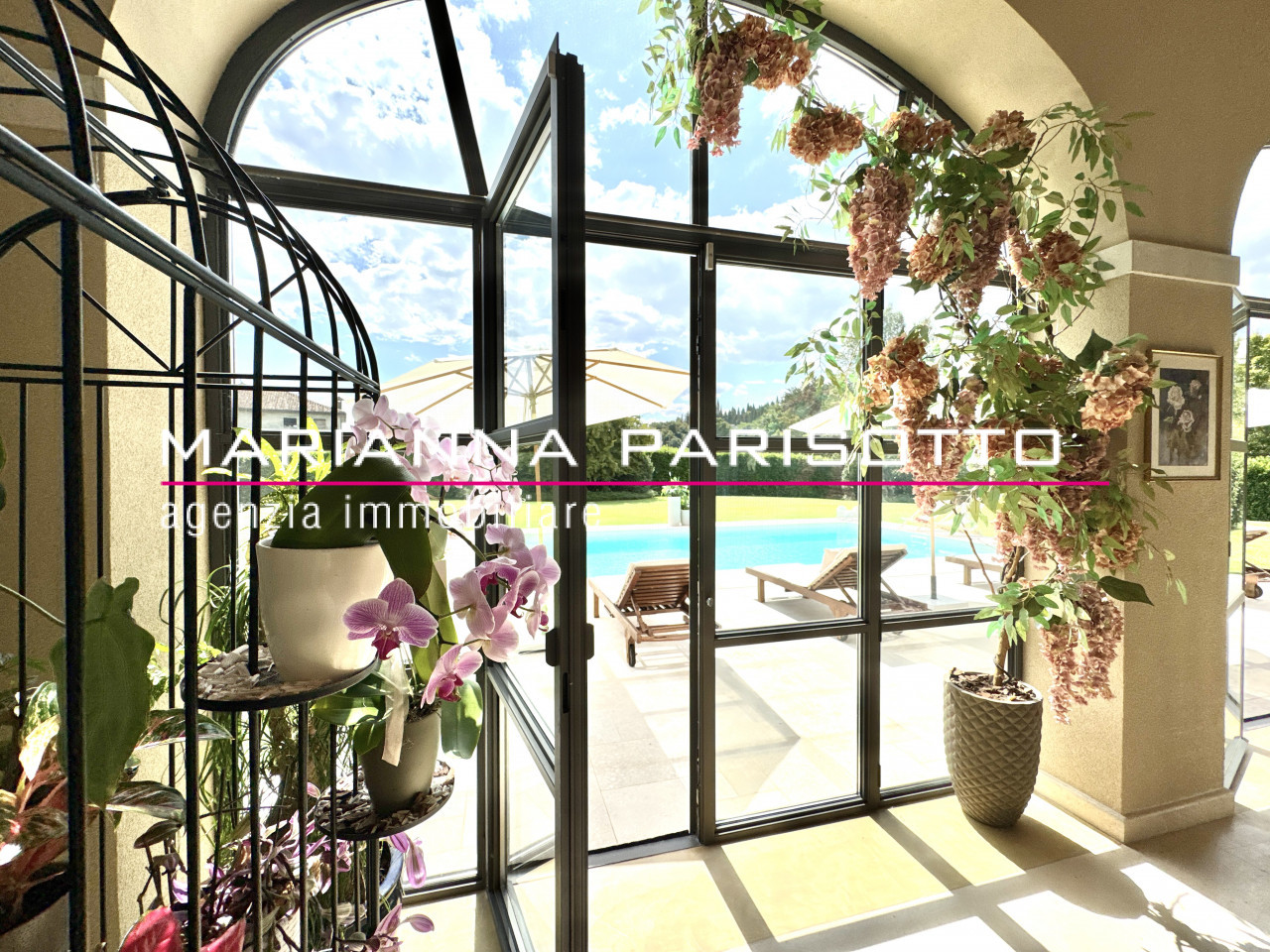 Il cuore pulsante della casa è un’elegante veranda luminosa che ospita l’ampio salotto affacciato direttamente sulla piscina, incorniciato da grandi vetrate ad arco che mettono in dialogo continuo l’interno con il parco. Gli spazi sono generosi ma perfettamente proporzionati, con zone conviviali pensate per accogliere, ma anche angoli intimi in cui ritrovare la quiete. Completano la zona giorno, la cucina con isola, una spaziosa sala da pranzo con caminetto, e un primo bagno di servizio. Ogni dettaglio parla di progettazione su misura, pensata per un vivere quotidiano senza compromessi.