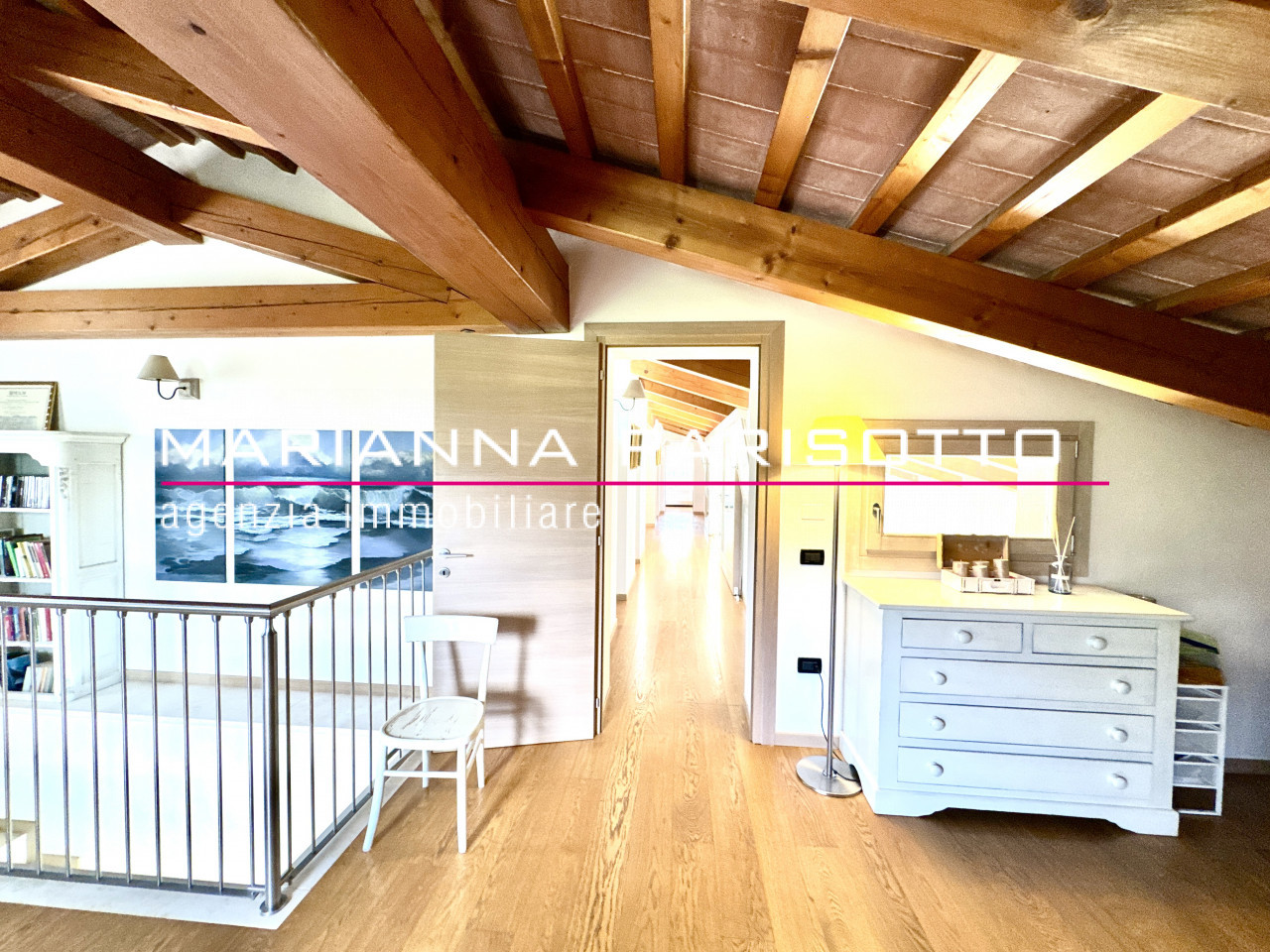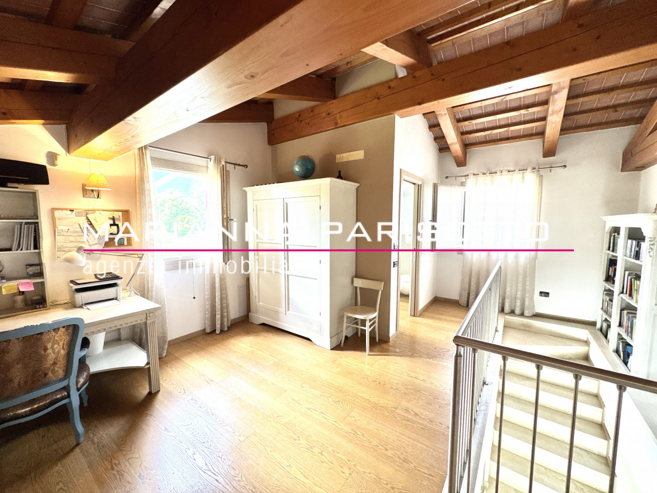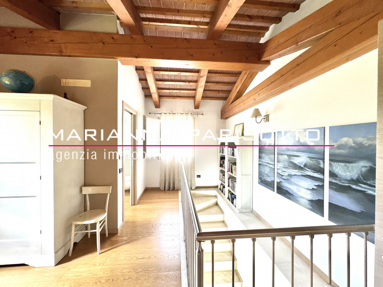 Una scala architettonica importante conduce al piano superiore, dove il tetto travato a vista e tavelle e il ballatoio di accesso ad ogni ambiente del primo piano affaccia sul salotto rendono il reparto notte un ambiente caldo, raccolto ma allo stesso tempo scenografico. Qui si trovano due suite padronali: una dotata di bagno privato e cabina armadio, l’altra anch’essa con bagno, collegata direttamente alla seconda cucina al piano terra — ideale per creare un appartamento indipendente per ospiti, genitori o figli adulti. Completano il piano due ulteriori camere doppie, arredate con boiserie e soluzioni intelligenti per ospitare con eleganza anche gli amici dei più giovani.