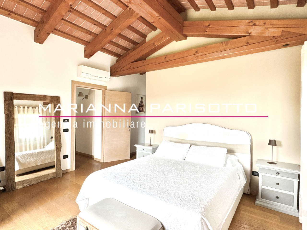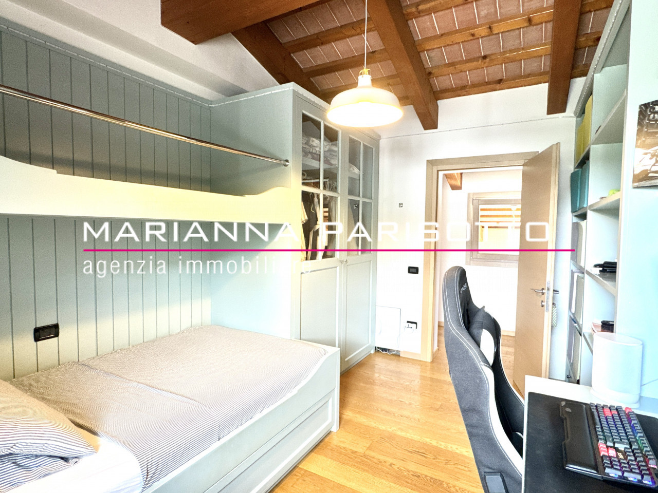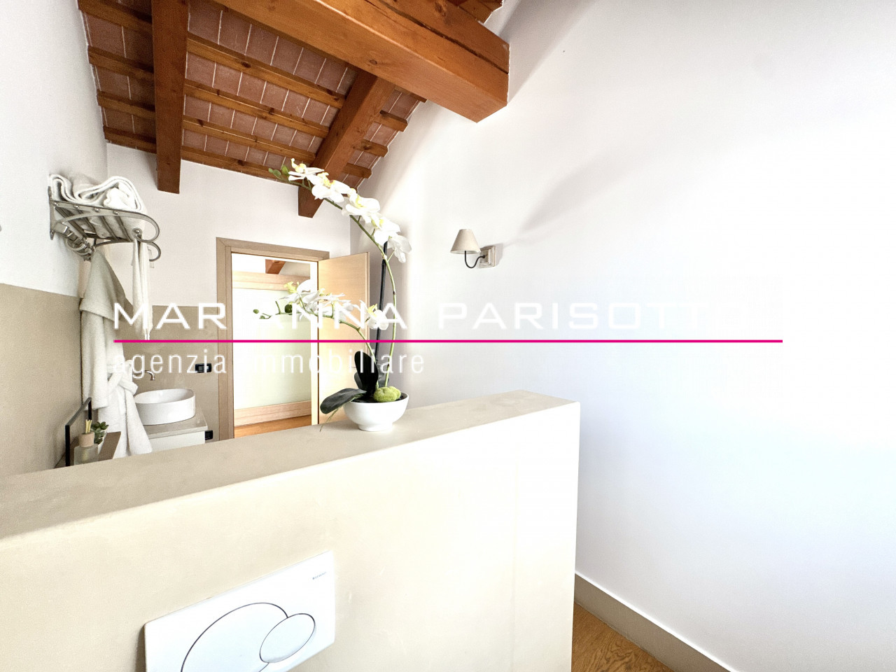 Una scala architettonica importante conduce al piano superiore, dove il tetto travato a vista e tavelle e il ballatoio di accesso ad ogni ambiente del primo piano affaccia sul salotto rendono il reparto notte un ambiente caldo, raccolto ma allo stesso tempo scenografico. Qui si trovano due suite padronali: una dotata di bagno privato e cabina armadio, l’altra anch’essa con bagno, collegata direttamente alla seconda cucina al piano terra — ideale per creare un appartamento indipendente per ospiti, genitori o figli adulti. Completano il piano due ulteriori camere doppie, arredate con boiserie e soluzioni intelligenti per ospitare con eleganza anche gli amici dei più giovani.